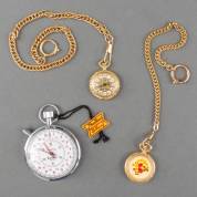 Onedel herenvestzakhorloge, Hanhart, daarbij twee vergulde en geëmailleerde damesremontoirs, aan vergulde horlogeketting, herenvestzakhorloge Ø 5 cm, damesremontoir circa Ø 3 cm