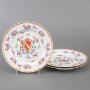 Drie Frans porseleinen famille rose borden met familiewapens, uitvoering Samson, Ø 23,5 cm