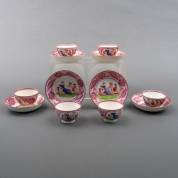 Zes lusterware kommetjes en schoteltjes met romantisch decor, uitvoering Dawson Sunderland, Engeland, circa 1820 -één kommetje gelijmd, defecten-, 5 x Ø 7 cm