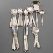 Verzilverd bestekgedeelte, voor Premie van de Maand Club, Albert Heijn, negen dinercouverts met messen, negen kleine couverts, zes dienlepels, en vier dienvorken, daarbij: één gelijkende kaasschaaf, uitvoering Gero