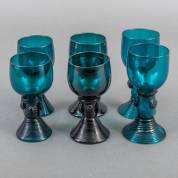 Zes diverse blauwgroene glazen roemers met braamnoppen, tweede helft 18e eeuw -één met chip in de voet, één fabricagefout in de kelk-, hoogste 13,4 cm