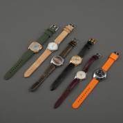 Zes herenpolshorloges: Edox, automaat, jaren '70, aan zwart gouden lederen band, Mathey-Tissot, verguld staal, automaat, aan zwart lederen band, Helbros, opwind aan cognac lederen band, Urika, automaat, aan oranje kunststof band, Yema, automaat, vergulde vierkante kast, aan groene kunststof band -kroon ontbreekt-, Bulova, quartz uurwerk, aan beige suede band