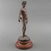 Gepatineerd bronzen beeld op houten basement: 'Les Lauriers', atleet met lauwerkrans, Frankrijk, circa 1900, 43 cm