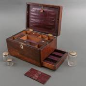 Palissander schrijf- en theekist met diverse compartimenten, glazen potjes en geheime lade, in de deksel een uitklapbaar schrijfblad -krimpscheur in de deksel, enkele potjes ontbreken-, 27,5 × 20 × 16 cm