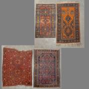 Vier diverse tapijtjes: Ersari met Saryk-gül -sleets-, Perzische Karadja, Hamadan en Belouche