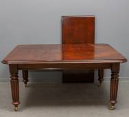 Wortelnotengefineerde uitschuifbare tafel met tussenblad op gecanneleerde poten met wieltjes, 20e eeuw -vochtschade op blad-, 77 × 165 × 125 cm
