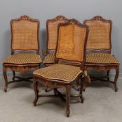 Vier gestoken eiken stoelen met rietbespanning en regelverbinding tussen de poten, enkele gestoken details voorzien van goudverf, de zitting met gestreepte kussens, 20e eeuw, 110 × 55 × 53 cm