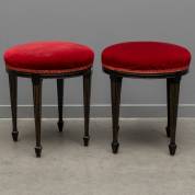 Paar gezwart houten krukjes met gouden details en rood fluwelen bekleding, Louis Seize-stijl, 20e eeuw -één wankel pootje met barst-, 42 × 40 cm