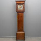 Engels staand horloge in eiken kast, de messing wijzerplaat met verzilverde cijferring, verguld metalen hoekstukken, minuut- en uuraanduiding, adres: Thomas Dicker I, Silchester, werkzaam 1736-1756 -defecten, slinger en gewichten ontbreken-, 198 × 44 × 26 cm