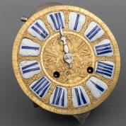 Eénwijzer uurwerk met bronzen wijzerplaat en twaalf witgeëmailleerde cijfercartouches -restauraties-, achtdaags uurwerk, 18e eeuw, zonder gewichten en slinger