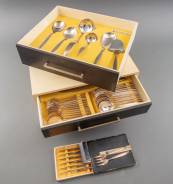 Zespersoons bestekcassette Gero 100 in bestekkist, bestaande uit: zes grote couverts, zes kleine couverts, zes grote messen, zes kleine messen, aansnijcouvert, groentelepel, aardappellepel, sauslepel, soeplepel, rijstlepel en kaasschaaf, daarbij: twee vleesvorkjes en zes fruitmessen in doosje -kist heeft defecten-