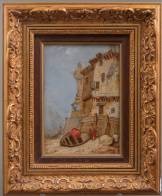Zuid-Europese School: huisjes aan de kust, olieverf op board, r.o. onduidelijk gemonogrammeerd en verso gedateerd 1874, 10 × 14,5 cm