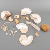 Verzameling schelpen en sponsachtigen, waaronder: diverse nautilusschelpen -één in doorsnede gezaagd-, tandschelpen, venusmandje etc., grootste nautilusschelp 16 × 13 × 8,5 cm