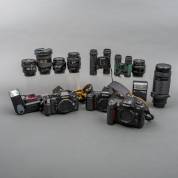 Digitale camera: Nikon D100, met zes objectieven: 20mm 1:2.8, 35-70mm, 1:3.3-4.5, AF Nikkor 18-35 MM 1:3.5-4.5D, AF Nikkor 28mm 1:2.8, AF Nikkor 75-300mm 1:4.5-5.6 en AF Nikkor 50MM 1.18, daarbij twee verrekijkertjes en twee analoge bodies: Nikon F501 en F801, verdeeld over twee aluminium Vanguard fotokoffers