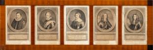 Vijf portretgravures: prinsen Van Oranje, door Jacobus Houbraken (1698-1780), tezamen ingelijst, formaat lijst 26,5 × 79 cm