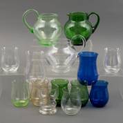 Diverse glazen waterkannen en waterglazen, waaronder gekleurde, en blank glazen vaasje, ontwerp Cornelis de Lorm, uitvoering Glasfabriek Leerdam, alle gemerkt, 16 × Ø 12 cm