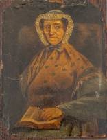 Hollandse School: portret van een vrouw met boek, olieverf op papier, niet gesigneerd, midden 19e eeuw -defecten, geplakt op paneel-, 16 × 12 cm