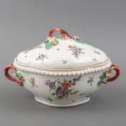 Europees porseleinen terrine met grepen in de vorm van bloesemtakken en voorzien van polychroom beschilderd bloemdecor, niet gemerkt, 18e eeuw -barst en chips-, 20 × 31 × 23 cm, herkomst: privécollectie van kunsthandelaar Abraham van der Meer (1927-2008), destijds gevestigd op de Spiegelgracht 3 te Amsterdam