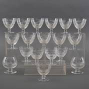 Glasservies met geslepen wilddecor, tweede kwart 20e eeuw, bestaande uit: elf grotere glazen op voet, vijf kleine glazen op voet, en twee cognacglazen op voet -enkele schilfers-, grootste glazen 10 cm hoog