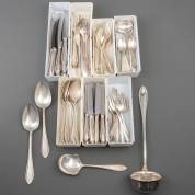 Verzilverd bestekgedeelte bestaande uit: twaalf dinervorken, tien dinermessen, twaalf dinerlepels, twaalf ontbijtvorken, twaalf ontbijtmessen, twaalf dessertvorken, twaalf dessertlepels, twee sauslepels, twee vleesvorken, een soeplepel, daarbij: puntfilet aardappellepel en twee groentelepels
