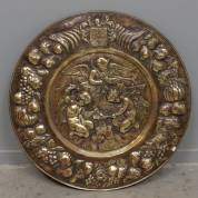 Grote koperen sierschotel met familiewapen en putti die Amor's liefdespijlen smeden, Ø 75 cm