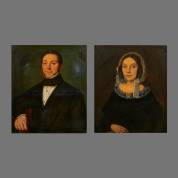 Johann Velten (1807-1883), paar pendantportretten van echtpaar, olieverf op doek, portret van de man gesigneerd en gedateerd 1843 -doffe plekken, restauraties-, 69 × 59 cm