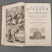 Boek: Novum Testamentum Graecum. Cum lectionibus variantibus. Studio et labore J. Milii. Oxonii, e theatro Sheldoniano. 1707. CLXVIII (14) 810, 64 pp. Folio. Kalfsleer uit de tijd. Met titelprent -rug en hoeken beschadigd-