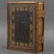 The Holy Bible. With marginal readings and parallel references and the commentaries of Henry and Scott condensed. Glasgow, W. Collins, Sons, circa 1870. 4to. Oorspr. leder, platten en rug verguld, goud op snee, kantbeslag en klampen. Met 25 chromolithografieën en 11 kaarten en gezichten -ontbreekt één blad;defekten aan de rug- 34 × 26 cm