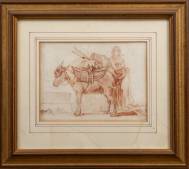 Hollandse School: bepakte ezel en jonge vrouw, roodkrijttekening, niet gesigneerd -passe-partout met waterschade-, 19 × 14 cm