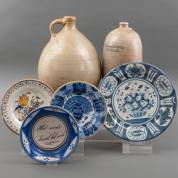 Twee grijs aardewerk kruiken, en vier diverse aardewerk borden, 18e en 19e eeuw -grootste schotel gerestaureerd-, hoogste kruik 42 cm