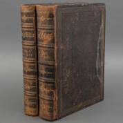 The Holy Bible. With a devotional and practical commentary by R. Jamieson and E.H. Bickersteth. London, J.S. Virtue, circa 1860. 2 delen. Folio. Oorspr. leder, goud op snee. Met gegraveerde titels, 2 kaarten en 37 gegraveerde platen -defect aan de rug en inktvlek in de voorsnede doorlopend in enkele bladen en prenten van één band; enkele andere gebruikssporen-, 38 × 29 cm