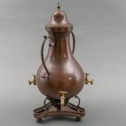 Koperen kraankan met drie kraantjes, staand op komfoor, 50 × Ø 21 cm