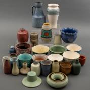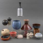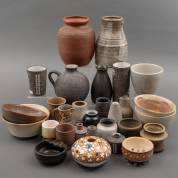 Verzameling kleine keramische objecten waaronder een dekseldoosje, vaasjes en cachépots, enkele gemerkt, voornamelijk Nederland, jaren '70-'90 -gebruikssporen-, 19 × Ø 6 cm
