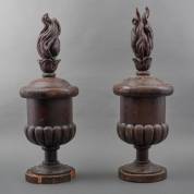 Paar houten vaasvormige ornamenten met vlam -houtwormschade-, hoogte 83 cm