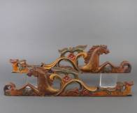 Paar gepolychromeerde houten ornamenten van een wagen in de vorm van bladeren en paardenkoppen, zogenaamde kortwagen, 19e eeuw, 89 × 21,5 cm
