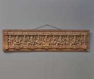 Indiaas hardhouten reliëfpaneel met decor van Ganesha's en danseressen, 45 × 181 cm