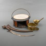 Mahonie stoof met marmeren warmteplaat, Willem III, 19e eeuw, koperen hondenhalsband vermaakt tot asbak, bronzen vijzel met stamper, en metalen kromzwaard in houten schede met inlegwerk, India, halsband Ø 14 cm