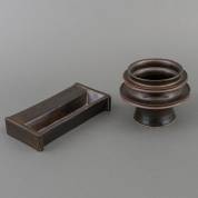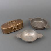 Twee tinnen papkommen en een koloniaal messing kistje, 8 × 22 × 11 cm