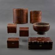 Drie diverse houten theekistjes, schrijfkist, paar boombast bakken en een schaal op voet -defecten-, hoogste boombast bak 22,5 × 25 cm