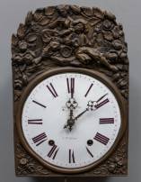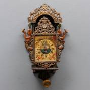 Kleine Friese stoelklok met beschilderde wijzerplaat, de loden fretten en achterplaat met engelendecor, 20e eeuw -enkele defecten-, 38 × 23 × 12,5 cm