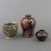 Han Boerrigter (1935-2020), twee keramische vaasjes, daarbij: Bob Ernsting (1955), keramiek cachépot, alle gesigneerd, jaren '70-'80 -enkele randchipjes-, 20 × Ø 14 cm