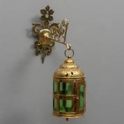 Messing hallantaarn met groen glazen ruitjes, barok-stijl, aan wandophanging met decor van een leeuw, hoogte lantaarn 26 cm