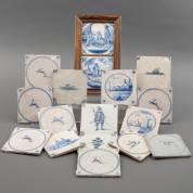 Vijftien Delftse tegels met blauw-wit decor van voornamelijk cirkeltegels met dieren, en twee Delftse tegels met blauw-wit decor van Bijbelse voorstellingen, in lijst, 17e/18e eeuw -gebruikssporen-, 13 × 13 cm