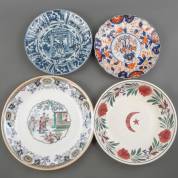 Vier diverse aardewerk en porseleinen schotels: één met transfer chinoiseriedecor, Petrus Regout, één met Turks wapen omgeven door boerenbont decor, één met Imari transferdecor -gerestaureerd-, en één met blauw-wit transferdecor in Wanli-stijl, grootste schotel Ø 42 cm