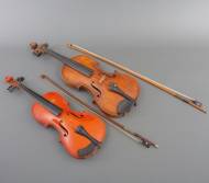 Viool, draagt label aan binnenzijde: 'Jean-Baptist Paris, medaille du conservation 1840', corpuslengte 36 cm -krul gelijmd-, in koffer met strijkstok, daarbij: kinderviool, corpuslengte 31 cm -gebruikssporen-, in koffer met strijkstok