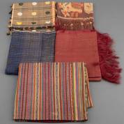Katoenen ikat sarong met complementair geweven Europese motieven, Timor, blauwe en rode supplementair geweven gouddraad doeken, Sumatra, kleine ikat doek, Sumba en vierkante katoenen doek met zijden supplementair geweven geometrische motieven, Indonesië -vlekjes-, rode doek: 180 × 58 cm