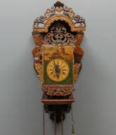 Friese stoelklok met polychroom decor: molens, bloemen en zeewezens, 19e eeuw -verfverlies, de loden ornamenten met beschadigingen, geen slinger-, 78 × 36 × 28 cm