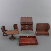 Houten poppensecretaire, dienblad met gehout decor en vierdelig ameublement, dienblad 22,5 × 16,5 cm