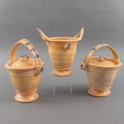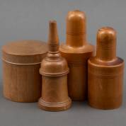 Vier treenware houders: twee voor glazen flesjes, twee voor talkpoeder -één flesje nog gevuld met vloeistof, stopjes aanwezig, gebruikssporen-, 13 cm