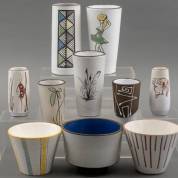 Zeven keramische vaasjes en drie bloempotten, de meeste met sgraffito voorstellingen, jaren '60 -kleine chipjes-, grootste vaas: 17,5 cm